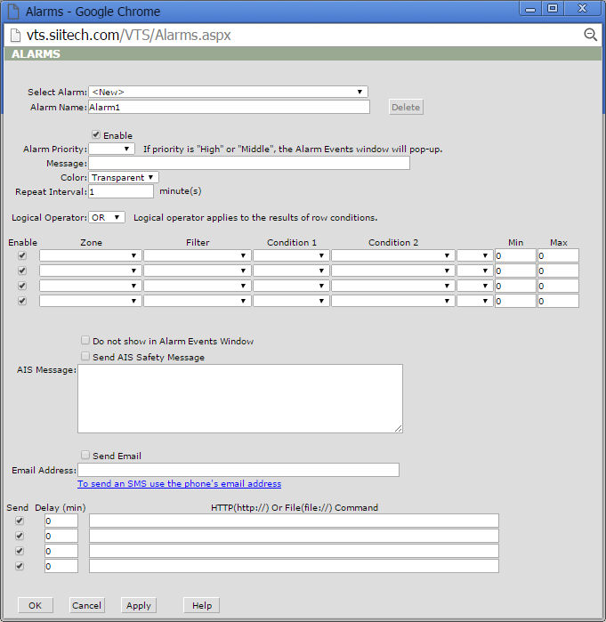 Send AIS Safety Message. Check this box to send AIS Safety Messages to ships which triggered this alarm. Note: Web VTS must have access to AIS transponder or AIS base station.