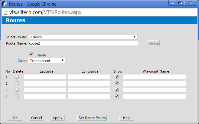 Latitude and Longitude. Enter the route's coordinates. Tip: click Set Route Points to select the coordinates on a map. Click Return to Designer to go back to the Route Designer.