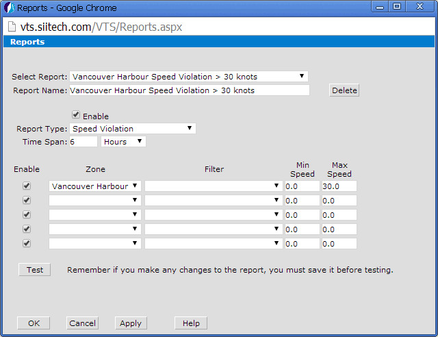 to open the Report Designer window.Click the Apply button to save your settings. Click the Test button to display the Speed Violation report.