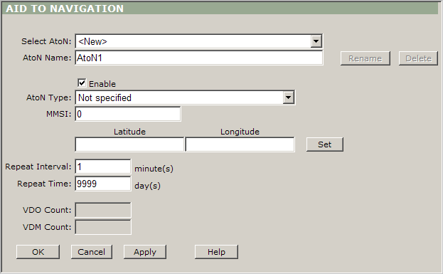 Latitude and Longitude: Type in these boxes AtoN’s position. Tip: Use the Set button to simplify this action.